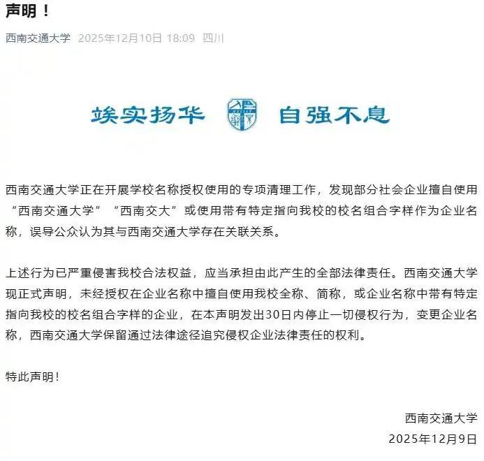 2025年12月10日,西南交通大学发表声明称,该校正在开展学校名称授权使用的专项清理工作,发现部分社会企业擅自使用“西南交通大学”“西南交大”或使用带有特定指向该校的校名组合字样作为企业名称,误导公众认为其与西南交通大学存在关联关系。