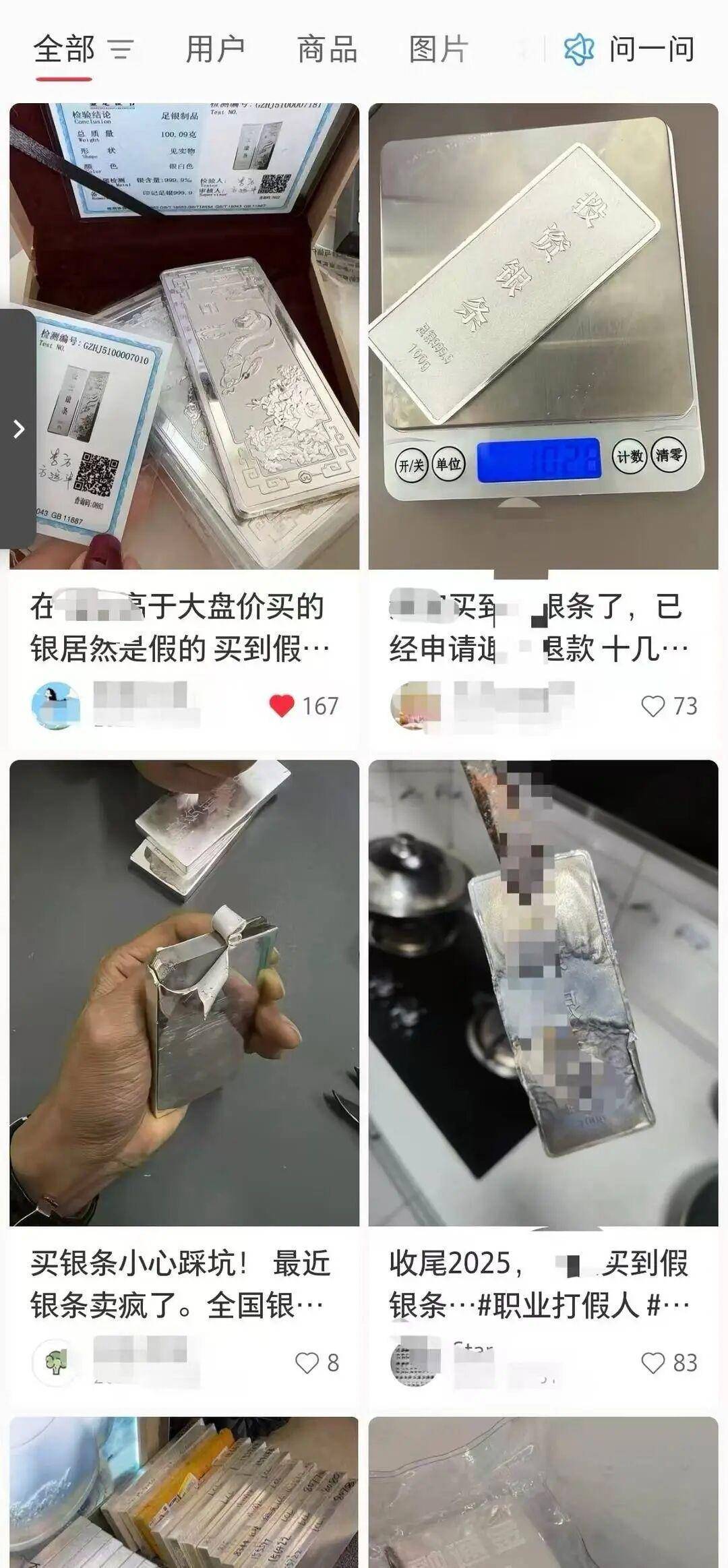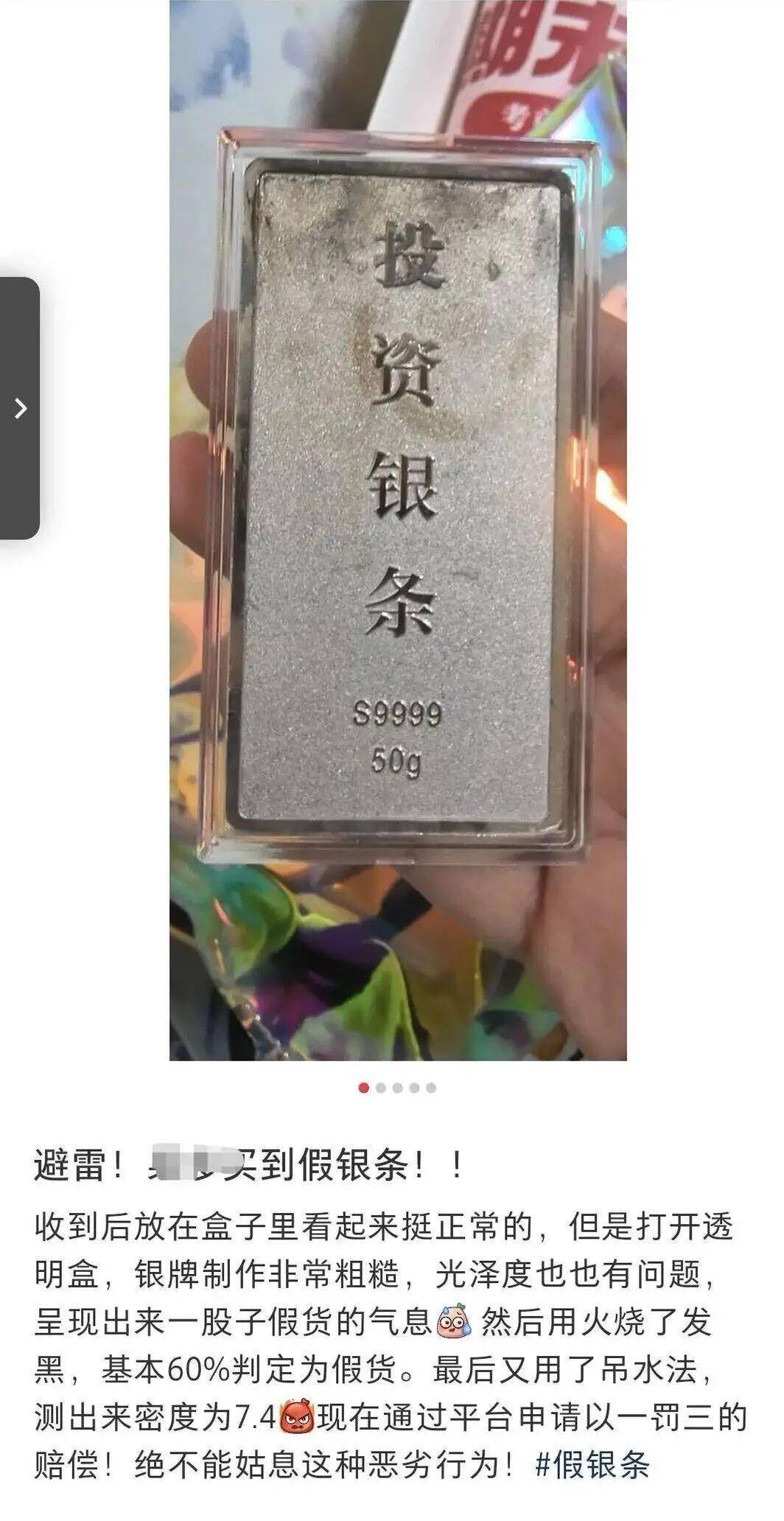 社交平台网友分享购买到假货银条经历 图片来源网络平台回复:已关注以上现象,将进一步核实处理对于杨先生购买假货银条的经历,记者随即在平台搜索他所提及的店铺,发现已关闭寻找不到;而张女士控诉延迟发货导致消费者亏损的店铺,问及延迟发货缘由,对方仅回复“拿不到货,没法及时发出去。”针对消费者集中投诉的假银条泛滥、商家延迟发货“打时间差”等问题,记者联系到涉事平台相关工作人员。工作人员表示,平台目前已收到多位消费者的投诉反馈,并且高度关注网购贵金属领域出现的这类乱象,接下来会对涉事商家展开全面核实调查。对于经核查确认存在销售假冒伪劣银条、拒不按约定时间发货等违规违法行为的商家,平台会严格按照平台规则及相关法律法规从严处置,包括采取下架违规商品、关停店铺账号、扣除商家保证金等措施外,还会将相关线索上报至市场监管部门,配合监管部门开展后续查处工作。同时该工作人员强调,平台始终坚定站位消费者立场,后续会加强对在售贵金属商品的抽检力度,畅通消费者投诉维权通道,简化退款理赔流程,切实维护消费者的合理诉求和合法权益。1月9日下午15点,张女士向记者反馈,目前商家已主动与她取得联系,承诺尽快发出此前单价18元/克的部分白银饰品。但对于剩余部分单价16元/克的白银订单,商家并未给出明确的发货时间。记者随即向商家核实情况,对方回应“有货了,会发的”。面对这样的回复,张女士深表怀疑。她坦言,经过此前的多次推诿拖延,自己已经不再相信商家的说辞,“只有实实在在拿到货品,心里才算踏实”。来源:封面新闻举报/反馈