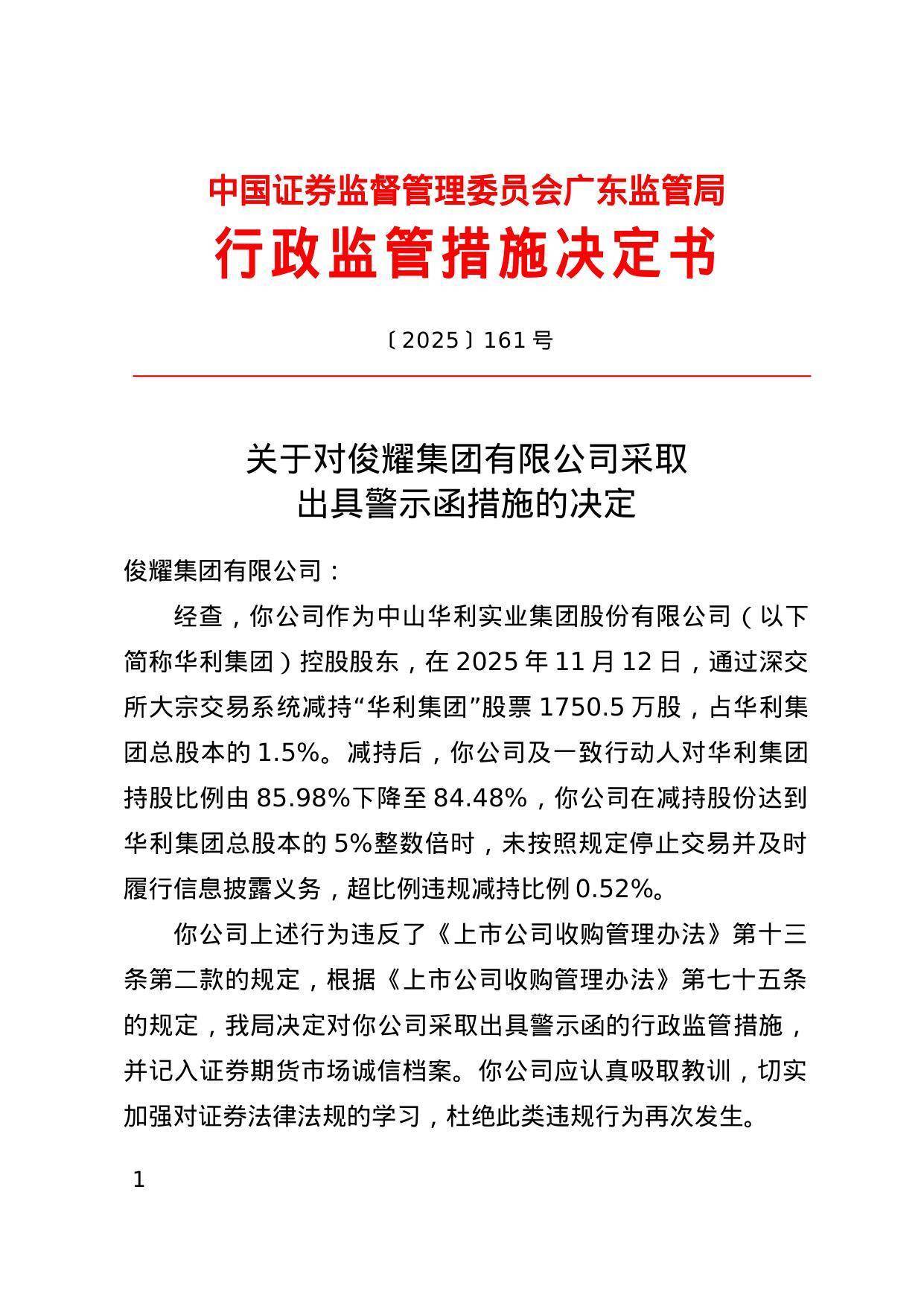 根据决定书,俊耀集团有限公司作为中山华利实业集团股份有限公司控股股东,在2025年11月12日,通过深交所大宗交易系统减持“华利集团”股票1750.5万股,占华利集团总股本的1.5%。减持后,公司及一致行动人对华利集团持股比例由85.98%下降至84.48%,公司在减持股份达到华利集团总股本的5%整数倍时,未按照规定停止交易并及时履行信息披露义务,超比例违规减持比例0.52%。