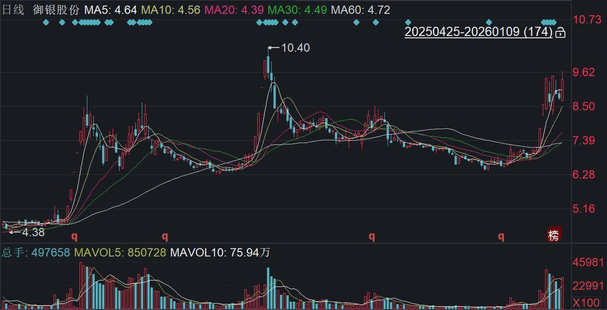 二级市场上,截至1月9日收盘,御银股份上涨6.97%报9.36元/股,总市值约71.25亿元,近一年公司股价累计上涨约107%。