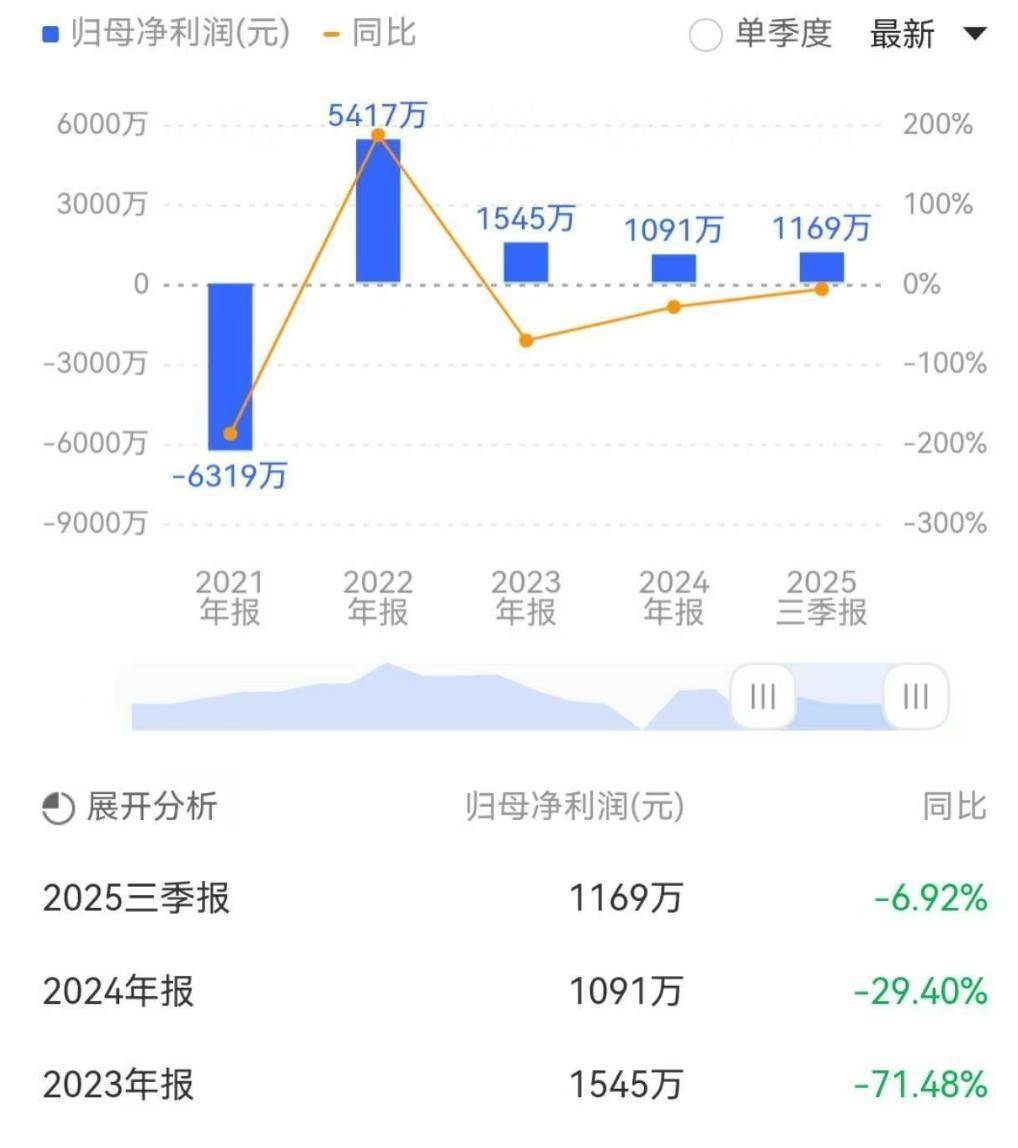 2025年前三季度,公司营收净利双双下滑,营业收入为4445.59万元,同比下降13.30%;归母净利润为1169.11万元,同比下降6.92%;扣非归母净利润为915.17万元,同比下降24.90%。