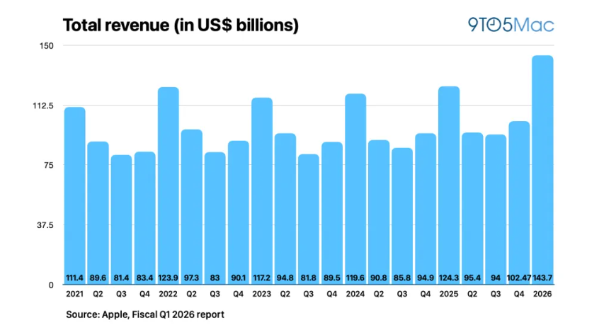 【CNMO科技消息】近日,苹果公司公布了2026财年第一季度财报,创下公司史上最佳季度表现。